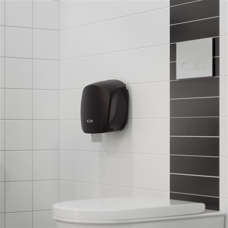 Czarny dozownik Katrin Jumbo L do dużego ruchu: kontrolowane dozowanie i rzadsze uzupełnianie