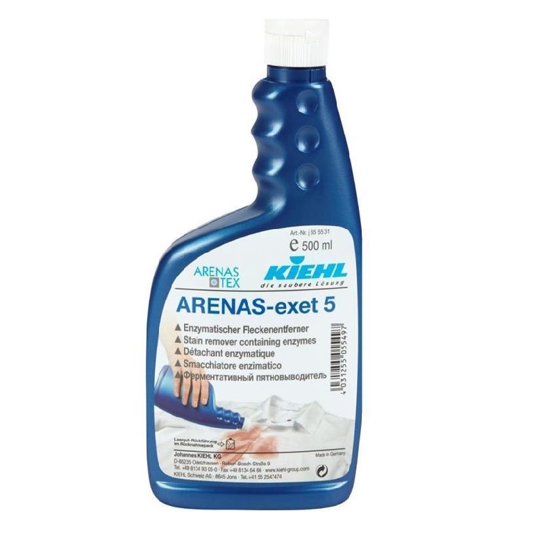 Kiehl Arenas-Exet 5 to specjalistyczny, płynny odplamiacz przeznaczony do usuwania zabrudzeń zawierających białko. Preparat został opracowany z myślą o wstępnym usuwaniu trudnych plam bezpośrednio przed procesem prania.